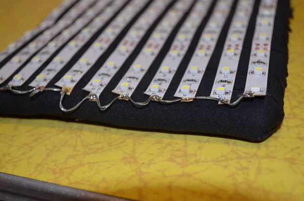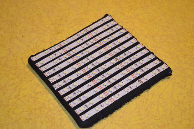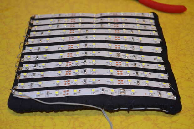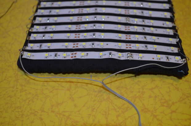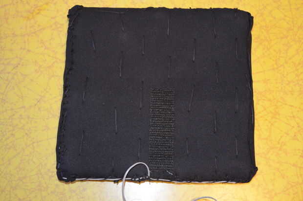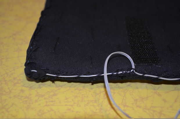 Con todo el cableado de hecho, el último paso fue a coser unas tiras de tela negra sobre los conectores expuestos y coser el cable al cuerpo del panel para poner en orden las cosas.