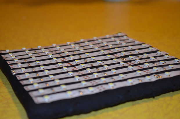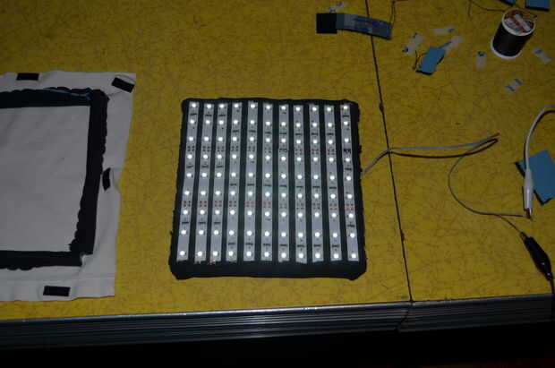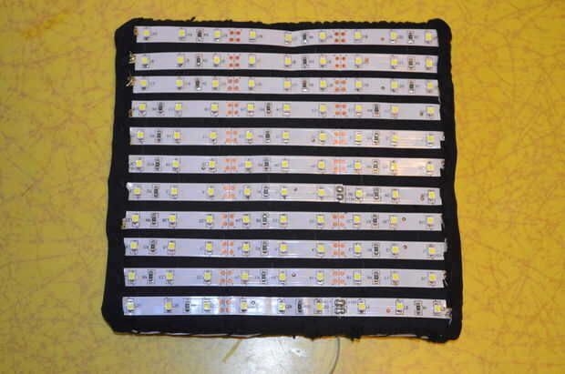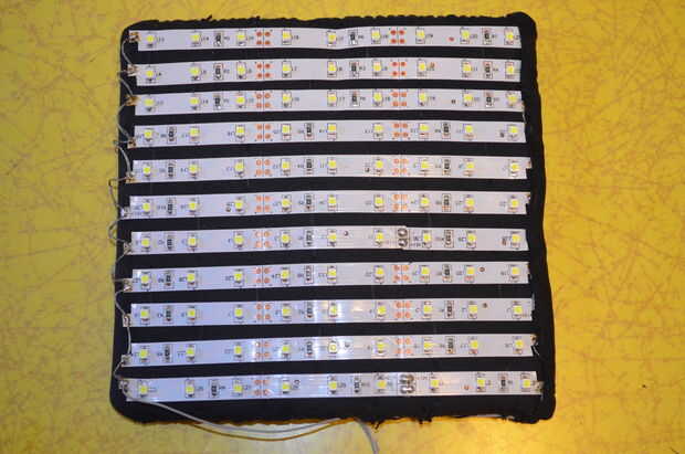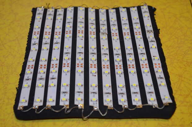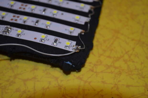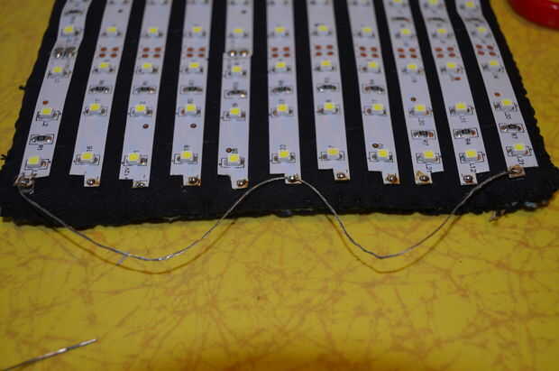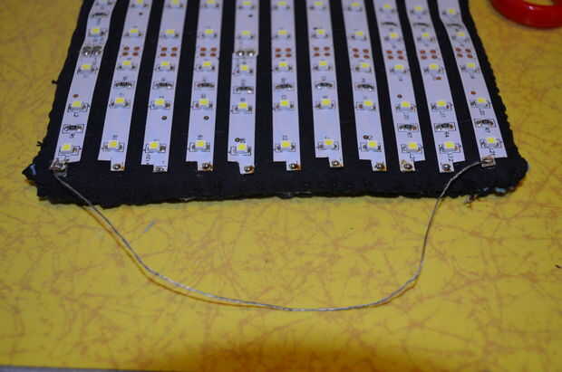 Una vez que fueron Unidas las tiras, que era tiempo de conéctelos juntos. Mi primer intento utilicé alambre de magneto, pero que resultó para ser demasiado rígido. Me decidí por utilizar alambre de un cable de cinta en un conector IDE. Quitó todo el plástico que cubre para utilizar sólo el alambre real. Hice 2 longitudes, cada uno aproximadamente 1.5 X la longitud del panel.