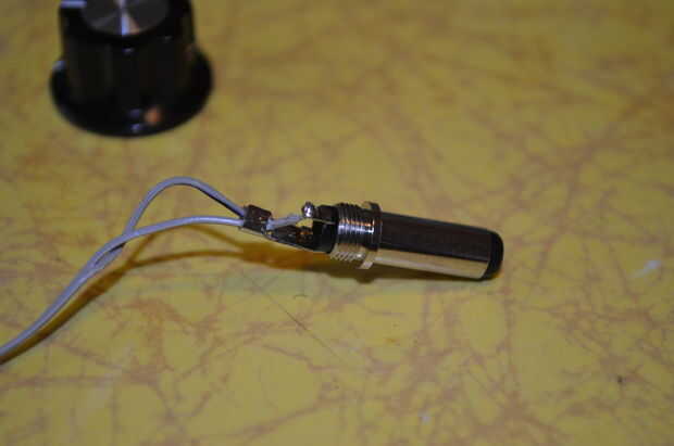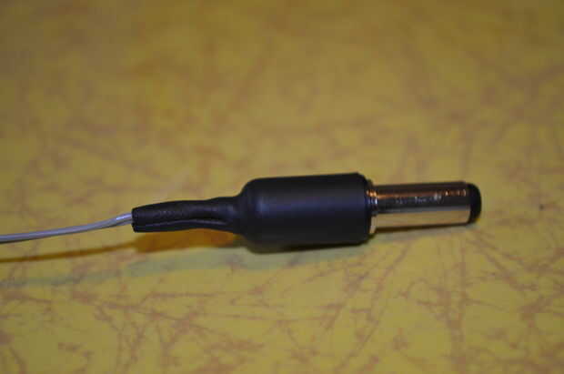 Tomó otro par de cables de cinta y dividirlo en parte aparte, luego soldar un extremo a cada lado. Luego esto terminado en un conector de alimentación tipo M para enchufar la pronto a ser la unidad de control. He utilizado un trozo de tubería encogible para limpiar y fortalecer la conexión.