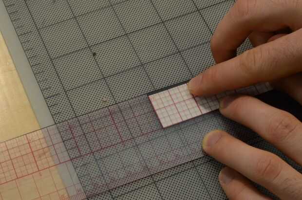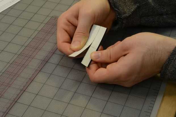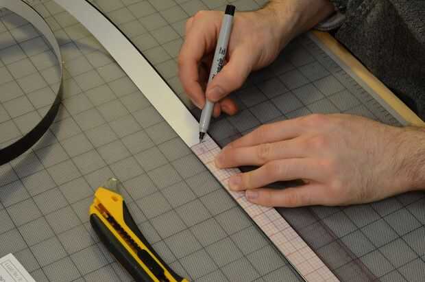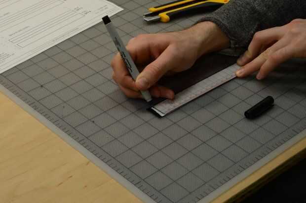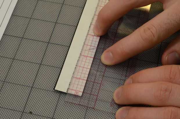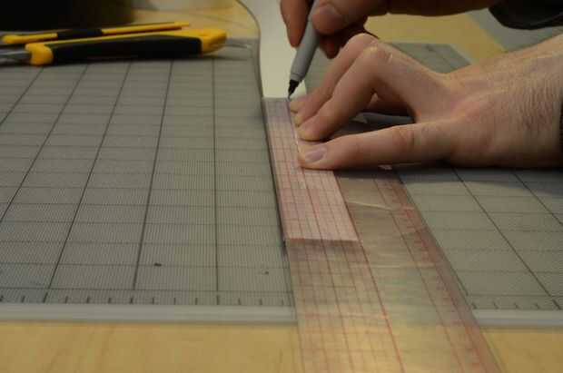 Ahora la marca a lo largo de la tira según la disposición, con el borde corto de la regla para dibujar líneas perpendiculares. Luego anotar y romper.