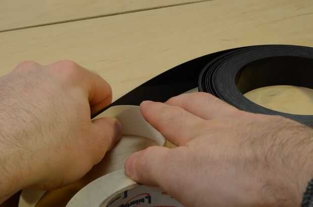 Llevar a cabo este procedimiento en una tabla para ayudar a mantener los rodillos alineados como se aplica la cinta de pegar para el delrin. Presione la cinta sobre el delrin como vas. Presionando suavemente sobre la cinta ayuda a mantenerlo sobre la mesa y evita que la cinta se deriva hacia arriba. Si esto ocurriese, puede inclinar la tira de delrin para tratar de rastrear hacia atrás contra la mesa.