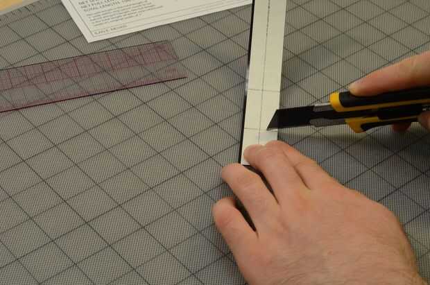 Lo lindo el delrin es que solo tienes que marcar con la Olfa y fácilmente se ajustar muy precisamente a lo largo de su línea. Marcar suavemente la tira más allá de la laminación para separarlo del resto de delrin laminada.