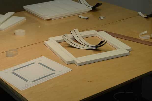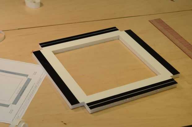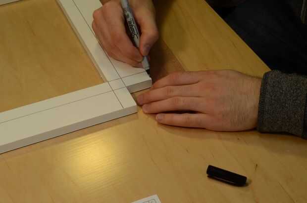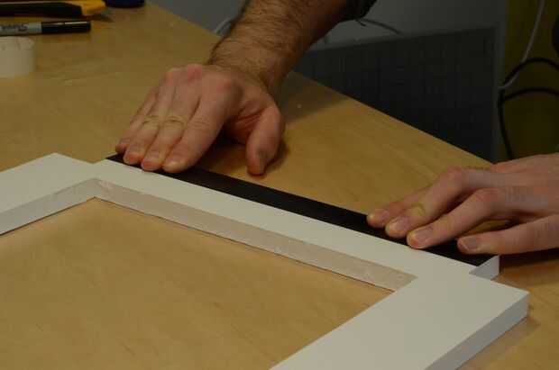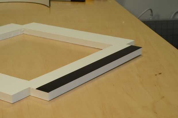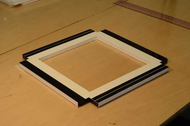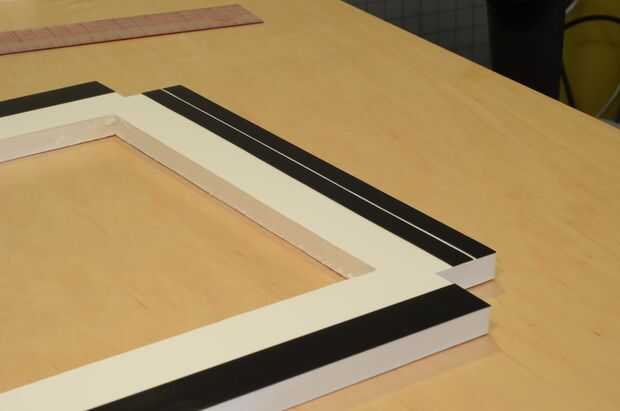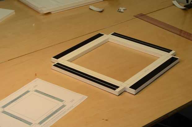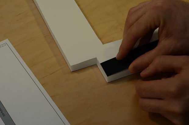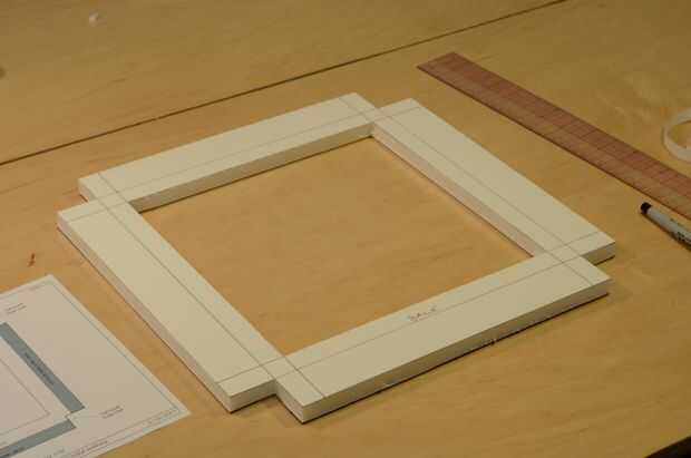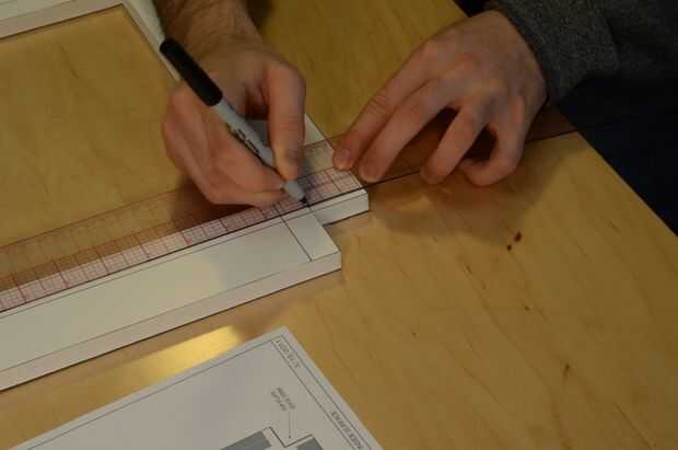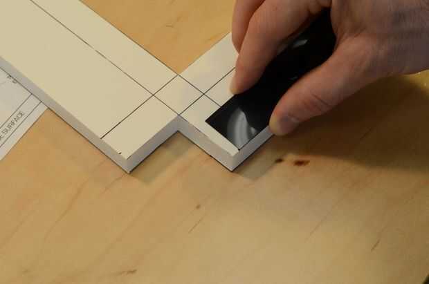 Te darás cuenta que se compensan las tiras de los bordes. Esto es que la placa superior pegar a la placa y las piernas. Utilizando el patrón de colocación como guía, marque estos desplazamientos en el interior la superficie de la placa trasera. COMPRUEBA QUE AMBOS MODELOS COMPARTEN UN BORDE COMÚN DE "DETRÁS DE LA MÁQUINA".