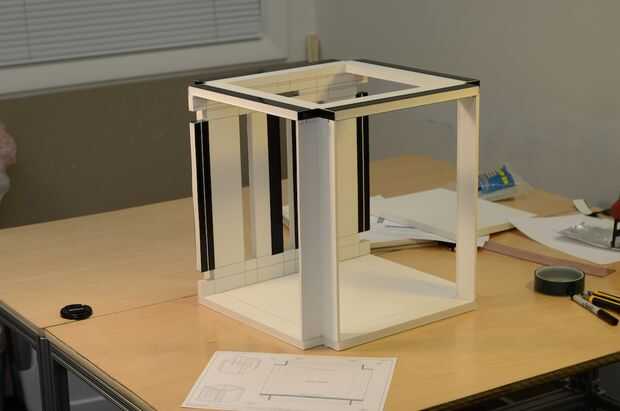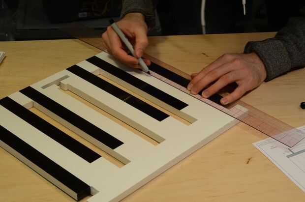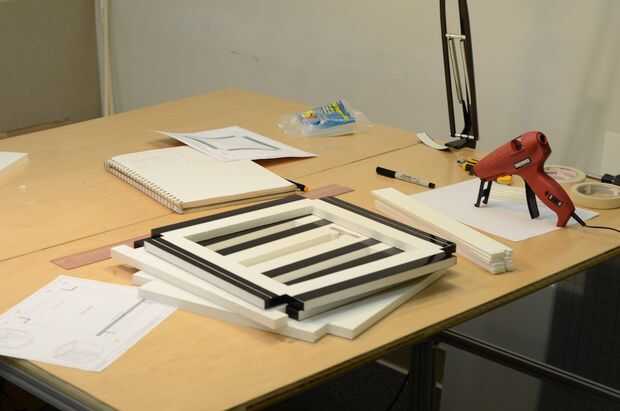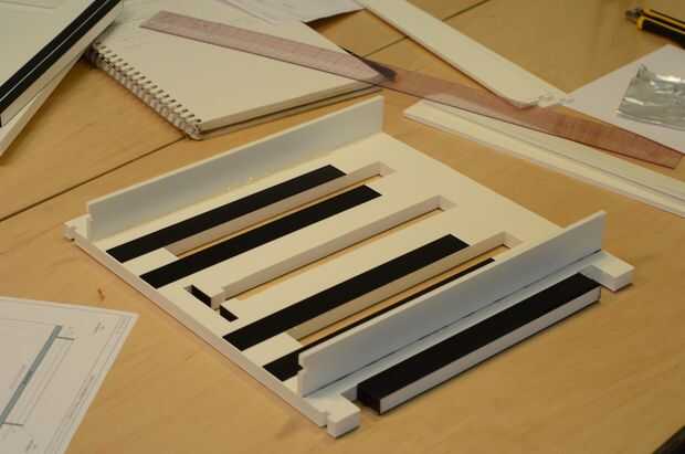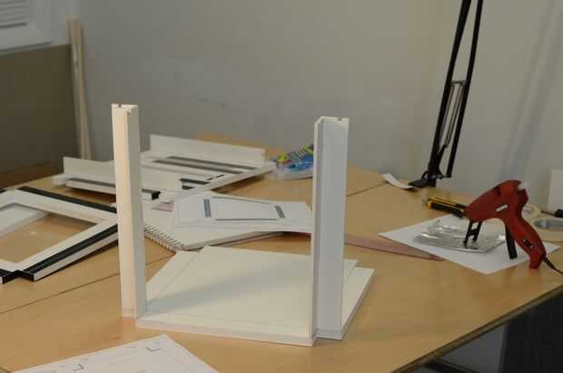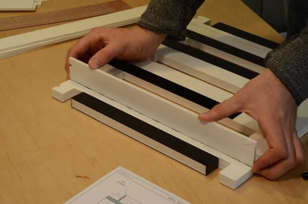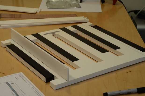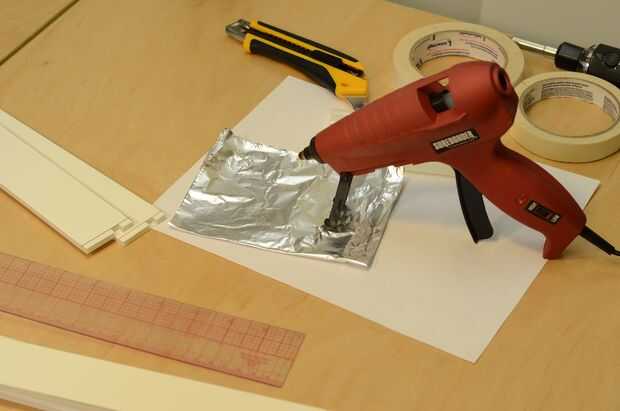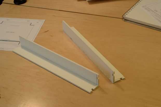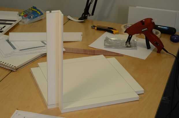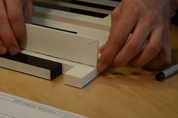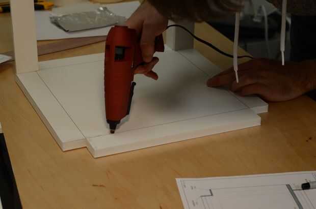 Comenzaremos por pegar patas angostas a la placa trasera. Las piernas deben colocarse como se muestra en el PDF adjunto, que se requiere dos líneas que se desprende de la placa posterior en 1-1/2" de cada lado.