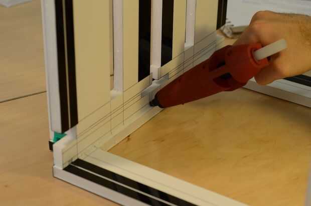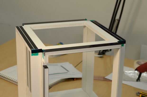 Temporalmente con cinta adhesiva la placa superior a la placa trasera y las patas delanteras con la cinta de poliéster verde. Luego voltee la máquina y aplique una tira de pegamento a lo largo del interior juntas, teniendo cuidado de no tener pegamento en las muescas. También puede ejecutar un cordón a lo largo de la Junta exterior con la placa trasera. Una vez que el adhesivo se seque Quite la cinta de poliéster.