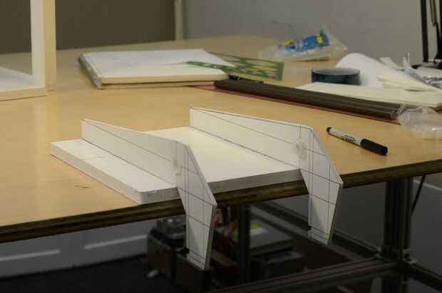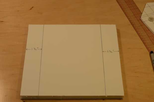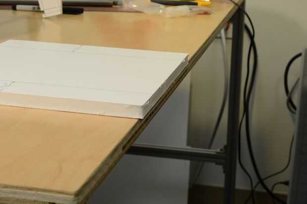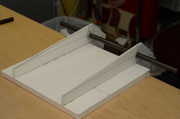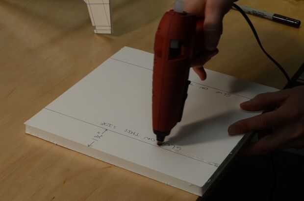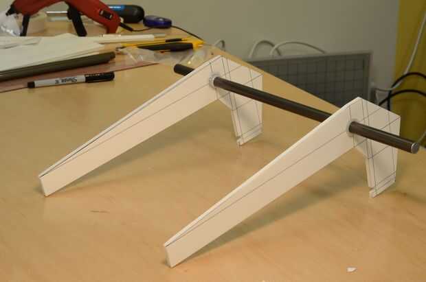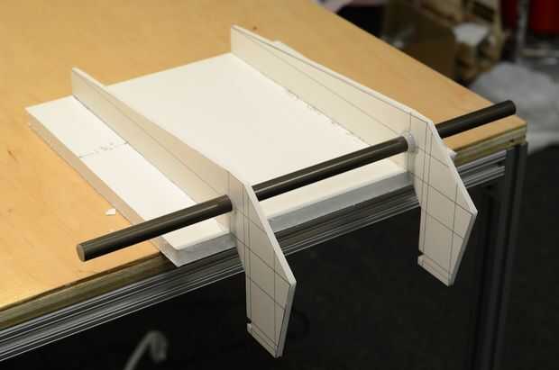 Coloque la mesa de la máquina a lo largo de un borde de la superficie de trabajo para que las líneas que marcó son perpendiculares al borde. Ejecutar cuentas de pegamento en el interior de ambas líneas y presione las costillas sobre el pegamento. Antes de la cola juegos Compruebe que los puntales contra las líneas en su interior (es decir, hacia el centro de la parte). Los bordes rectos de los puntales sólo deben ajustarse a lo largo de la longitud de la mesa de la máquina.