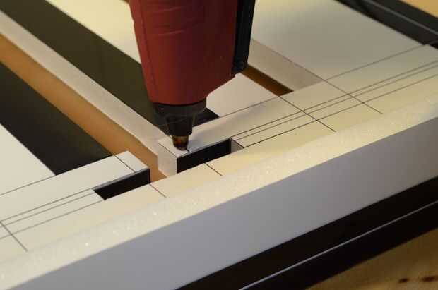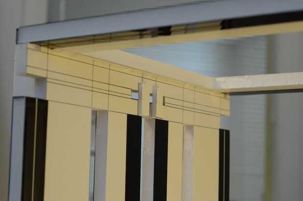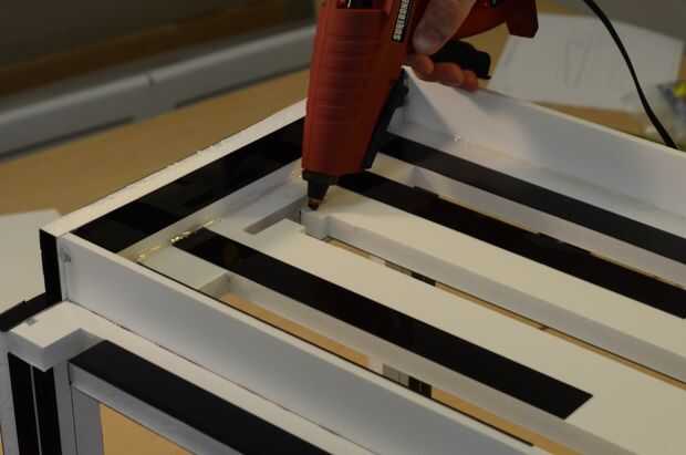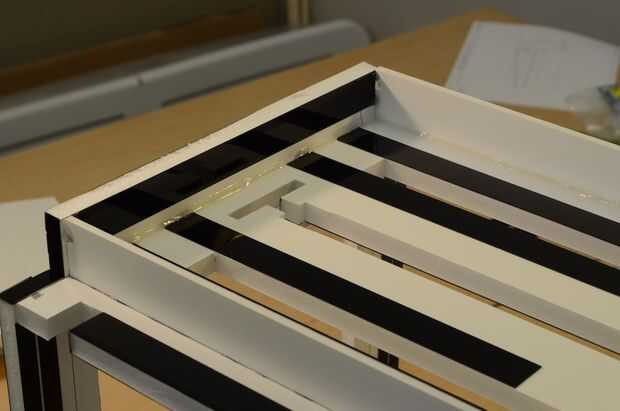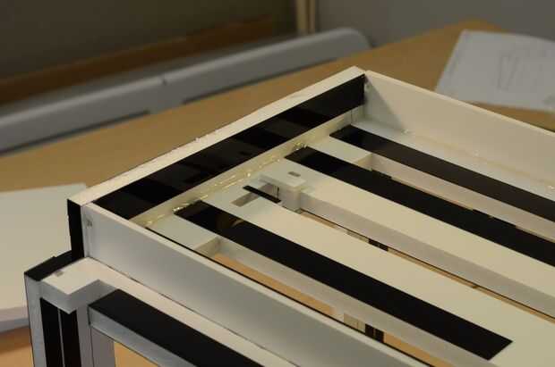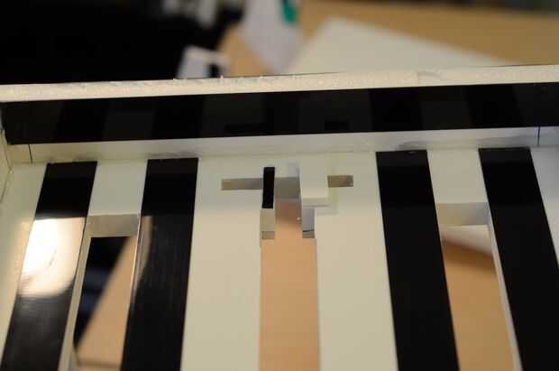 A continuación, coloque las tiras de laminado 1/2 "x 1" delrin a los lados de las costillas como se muestra en las fotos. Las tiras deben quedar la más mínima poco pasado el comienzo de la ranura a ambos lados de cada puntal. El propósito de estas tiras es actuar como superficie de rodamiento de tacos de madera que caben dentro de estas muescas.