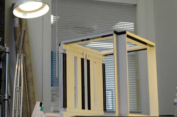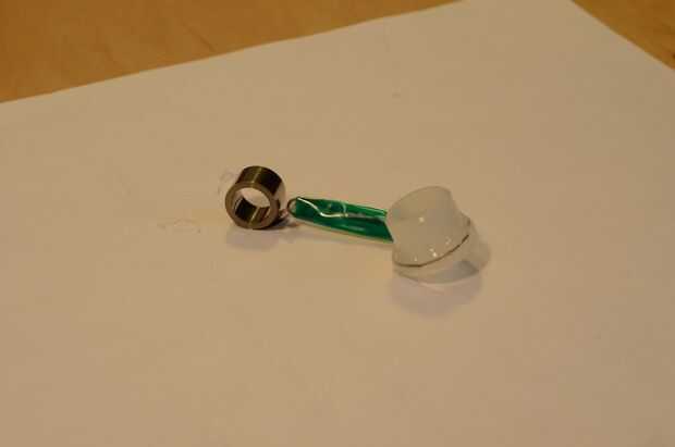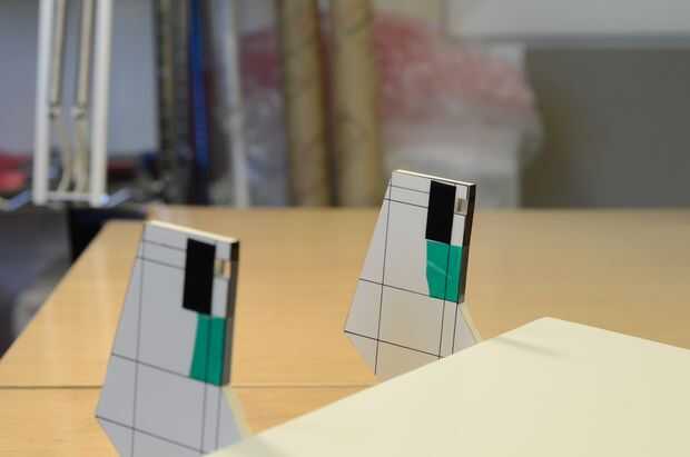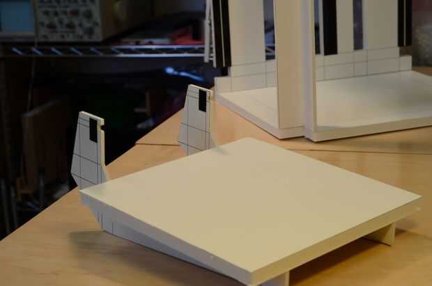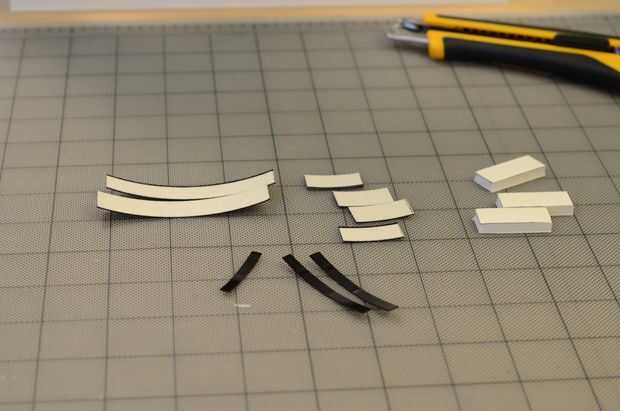 En primer lugar, cortar los componentes en el patrón de corte adjuntado. Nota que algunos de ellos son delrin y algunos son cartón pluma y también que algunos de lo delrin no es laminado con adhesivo de pegamento doble.