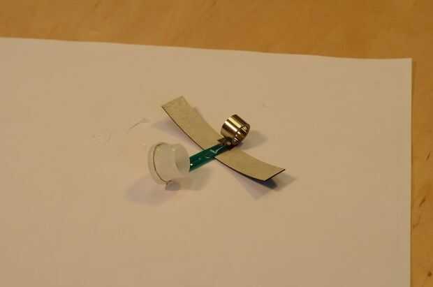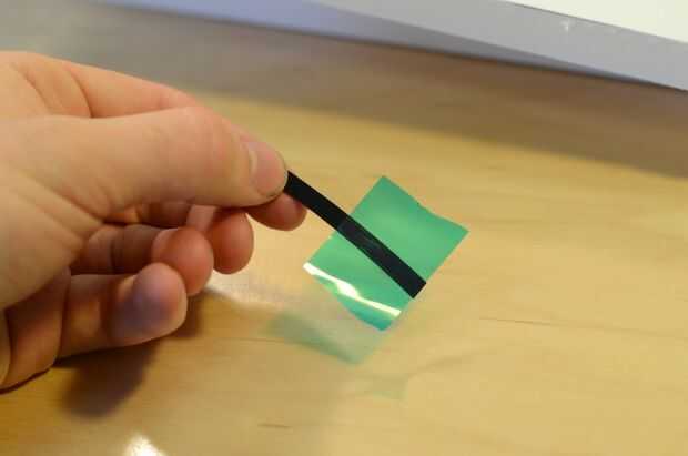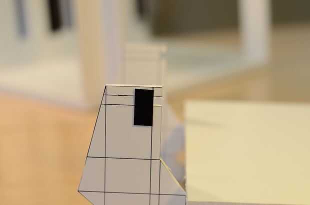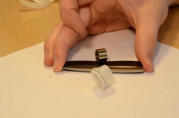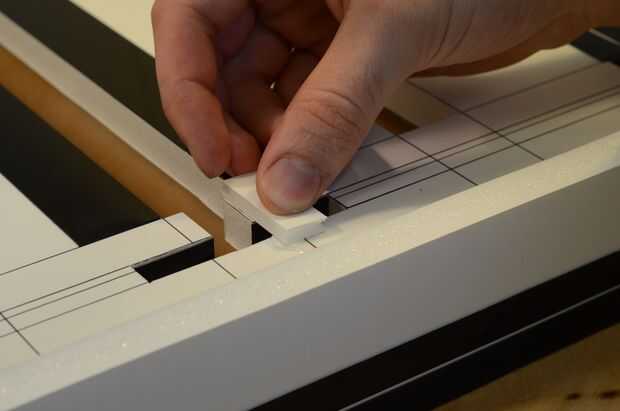 Pegue las tiras de cartón pluma de 1/2 "x 1-1/4" y 3/16 "x 1-1/4" franja de delrin para la placa trasera como se muestra. Dos tiras de cartón pluma deben horcajadas la ranura horizontal en la parte superior central de la placa en el interior. En el exterior, una tira de cartón pluma solo debe horcajadas esa ranura en un lado y la correa de delrin fino por el otro. Estas tiras retendrá un 2" espiga de madera en la hendidura, que a su vez es la celebración de la counterspring.