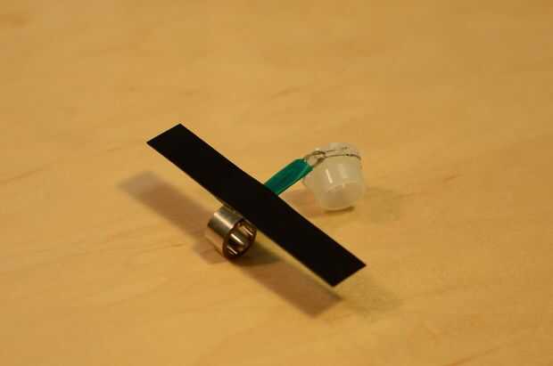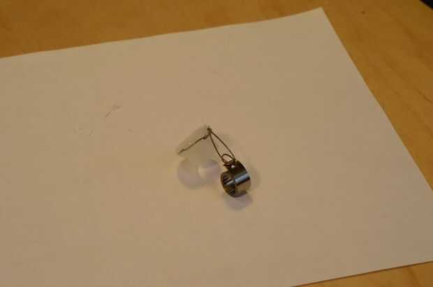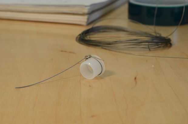 Por último, preparamos la Asamblea counterspring. Con el cortador de alambre, corte aproximadamente 6" del cable. Pase una vez alrededor del buje de nylon y un nudo. Luego aplique un cordón de pegamento alrededor del alambre para sostenerlo en el manguito. Ate el otro extremo el orificio en el resorte de fuerza constante por lo que hay alrededor de una pulgada de cuerda entre el resorte y el buje. Coloque algunos cinta poliester alrededor del alambre. Luego emparedado el extremo del resorte de fuerza constante con dos tiras de delrin como se muestra. Esto evitará que el resorte de torsión como se extiende - esperar unos pasos para que todo tiene más sentido.