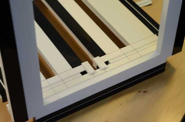Usando cinta de poliéster, coloque las tiras de delrin de 3/16 "x 2" como se muestra en la imagen. Deben ser pegadas a los bordes de las costillas con la cinta por debajo de la muesca. Estas flexiones conservan los tacos de madera que insertamos más adelante.