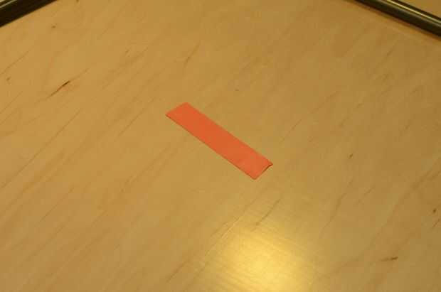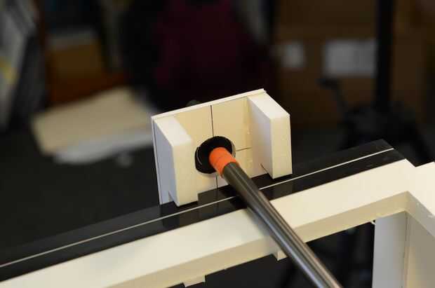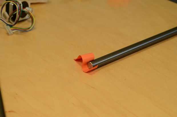 Uno de los soportes del motor descanse sobre el borde de la placa superior como se muestra y retire el papel protector del adhesivo que rodea el orificio. Deslice el eje de aluminio a través del agujero que el eje esté en contacto con las tiras de delrin en la placa superior. El propósito de esta operación es el motor para el montaje en una posición que alinea a la altura correcta con la placa superior de la cinta. Antes de presionar el motor en el adhesivo, trate de alinear el eje con el centro del agujero en dirección lateral.