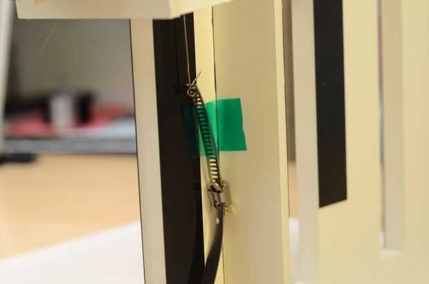 Levante el resorte de fuerza constante hasta que está sentado en la ranura horizontal en la parte superior central de la placa y bloquear en su lugar con la clavija de madera de 2".