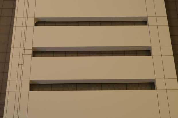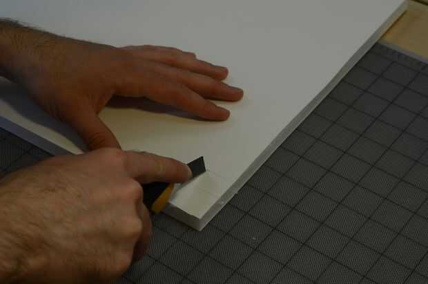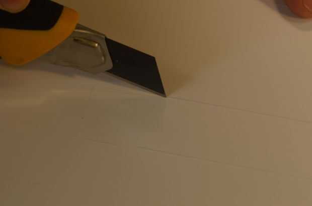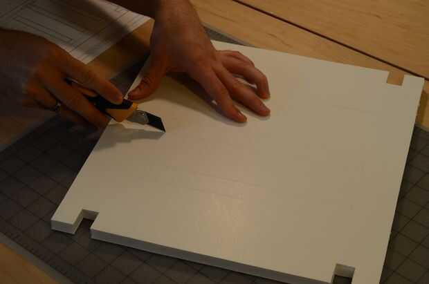 Las dos pequeñas muescas en la parte superior del panel son permitir pasar cables de acero. Porque la parte es tan grande y relativamente cuadrada, es seguro apoyarse en su borde inferior y corte las ranuras de la parte superior. Una vez que hayas cortado los lados verticales de cada muesca, corte a través de la superficie de papel en cada lado y luego arrancar la muesca.