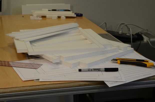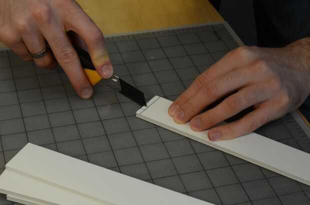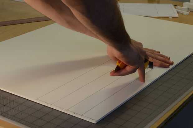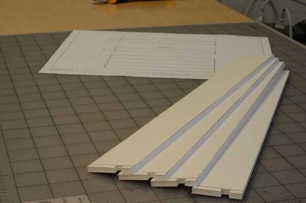 Antes de cortar el diseño general de lo restantes foamcore, cortar todos los bordes laterales de las piernas. Luego separar las piernas el foamcore restantes a lo largo de sus extremos más cortos.