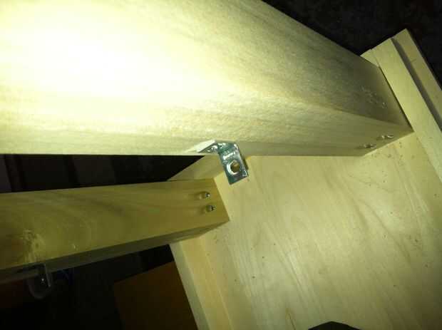 Comprar pequeños soportes en L o soportes del estante. Generalmente vienen con tornillos con ellos. Medida 23 1/2" de la parte inferior de cada pata y coloque un soporte en cada pierna. Esto es para el estante superior.