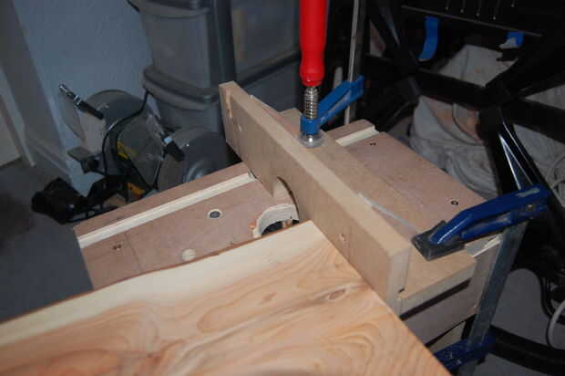 Siguiente paso fue cortar las espigas en la parte superior de las piernas. Usé mi router ahora montado en una tabla con una valla a cortar el final de la Junta para ajustar correctamente la altura de la broca. Para ello que puse a la altura a menos que lo necesario y cortar a ambos lados de la Junta, la anchura final en la mortaja y gradualmente aumentó la altura hasta que la espiga le dio un apretado ajuste. Una vez que la altura fue lo fue sólo un caso de cortar el resto de la espiga ajustando la guía a la posición correcta para darme una espiga profunda de 25mm.