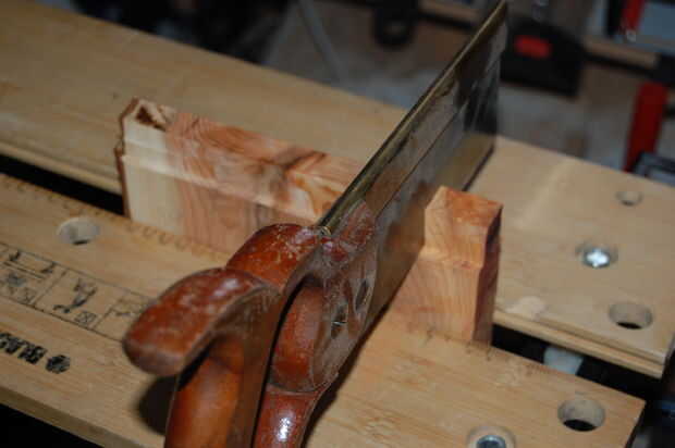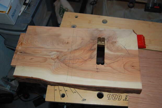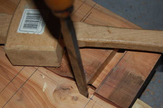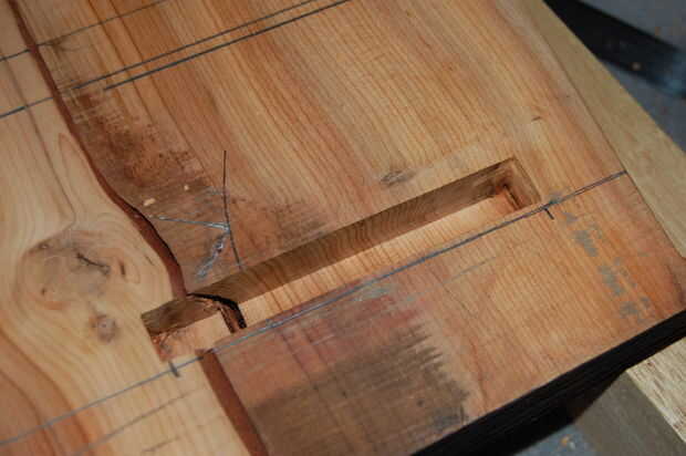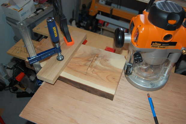 Originalmente tenía la intención de cortar mortajas usando un cincel pero después de cortar parte de allí era demasiado movimiento debido a las grietas a lo largo de la Junta que creó un poco de breakout, así que me mudé a usando el router en lugar de otro. Esto significa que el ancho de las mortajas se estableció en la anchura del cincel para que tuvieran a la ruta en dos pasadas como mi cincel era más ancha que mi broca recta. Utilicé una pinza como un borde recto para mi router seguir y marcó la posición de la base para el comienzo y puntos finales de cada ranura. Para cada ranura sólo corte alrededor 3-5mm de profundidad en un momento así para no tensionar la broca de fresadora, cada ranura finalizó a alrededor de 25mm de profundidad, luego corté la Plaza extremos con un formón de mortaja.