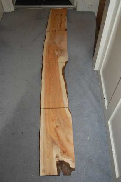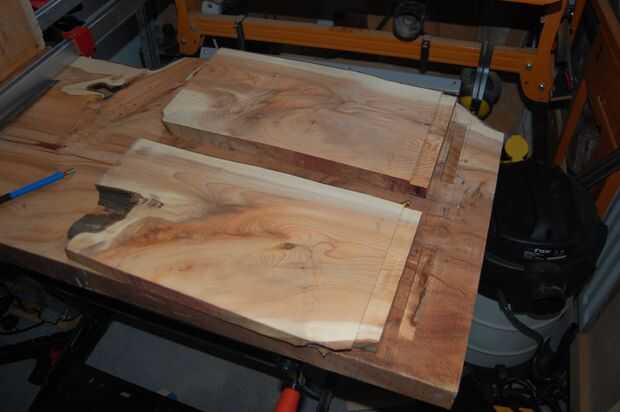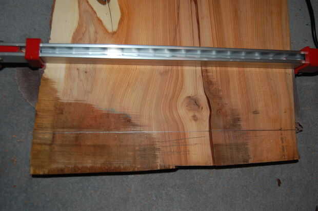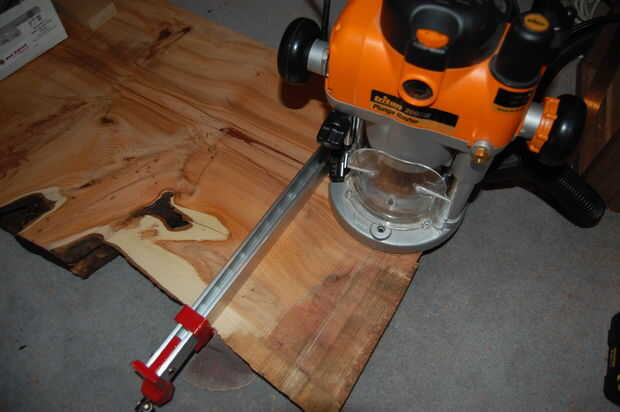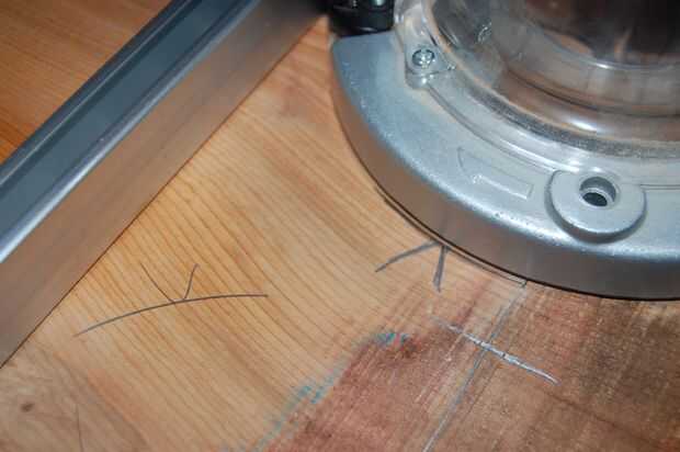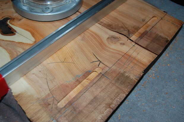 El siguiente paso fue cortar las mortajas la parte inferior del tablero de la mesa con un router de mano. Como la Junta no era cuadrada y los extremos no paralelos marqué el primer conjunto de pierna indicada ranurado paralelo a uno de los extremos y el otro conjunto paralelo a los primeros, esto haría que al menos todas las Plaza de las piernas y paralelo que ayudaría con estantes de fondo más tarde.