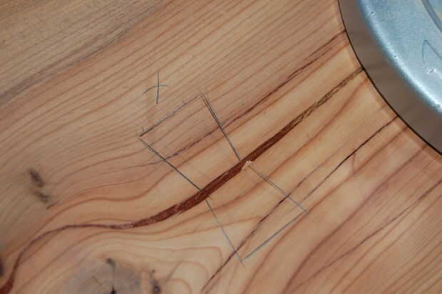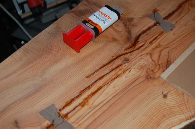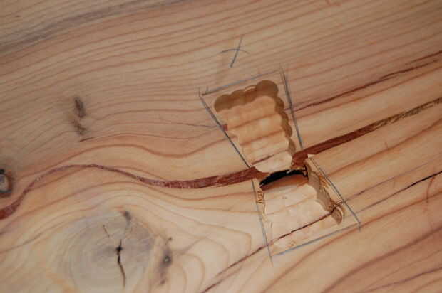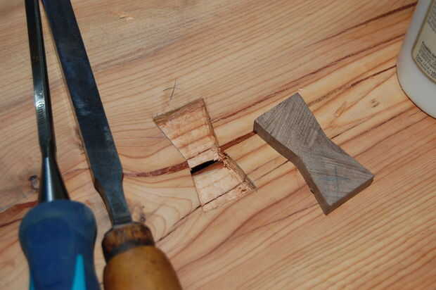 Después tuve las ranuras completadas llené las grietas grandes con un adhesivo epoxi de dos componentes, goteo con un clavo en cuanto a no hacer demasiado lío. Antes de que curó completamente quité una gran parte de la propagación con un cincel seguido lijando una vez había establecido sólido. El resultado final no estaba mal, que tenía un gran agujero para llenar el adyacente a la ranura del final cuando un trozo de madera apareció cuando yo estaba cincelado y el epoxi tomó un color verde, inusual, pero puedo vivir con él.