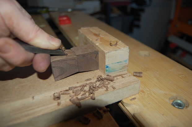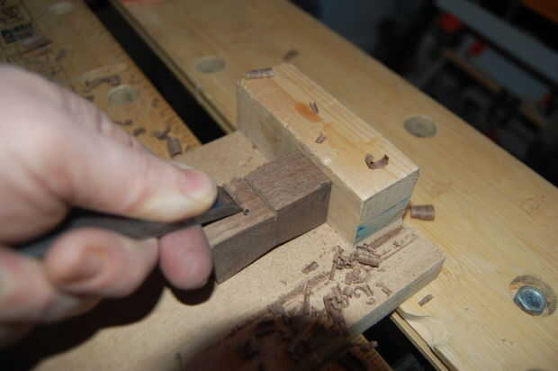 Una sierra sería probablemente la forma más rápida y sencilla de cortar las ranuras que necesita buen bordes rectos, pero como no tengo que utilizar una sierra y un cincel. Determina el tamaño de las ranuras mirando mi madera de desecho, me encontré con una longitud de nogal de sección cuadrada que parecía una buena anchura y corta longitud de 75mm. Me marcó la mitad de las piezas y luego señala en las líneas de las esquinas del eje en un ángulo de 8 grados con un marcador de cola de Milano. Después de haber conseguido el contorno aserrado por el eje hasta el final de los dientes y luego a la pared de los bordes en la parte inferior de la sierra corte con un cincel. Como las ranuras eran tan gruesas yo trabaje con ella cada uno en dos.