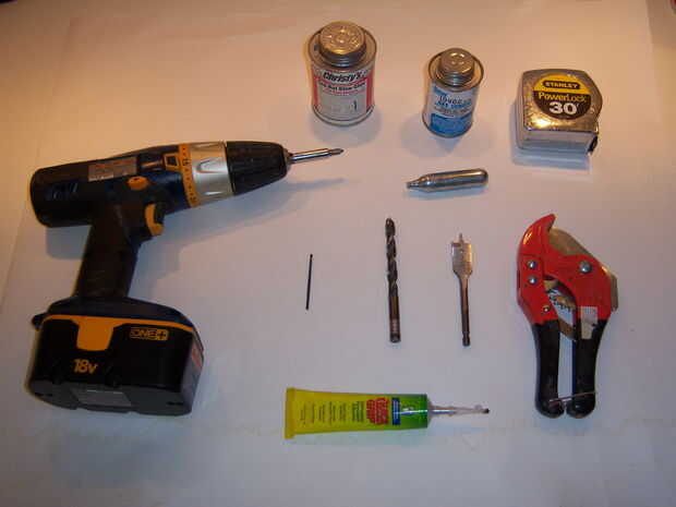 Destornillador/Taladro de 3/32 broca taladro 3/8 bit ¾ taladro bit tubo PVC cortadores medición dispositivo 12 gramos CO2 el cartucho vacío PVC pegamento ABS cemento todos propósito adhesivo permanente o Epoxy Sierra y caja de ingletes (opcional/no se muestra) Dremel con lijado de rueda (opcional/no se muestra) borde recto (opcional/no se muestra)