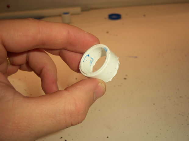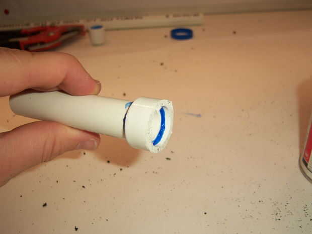 Corte 4" pieza de la ½" del PVC. Corte 5/8" de un extremo de la Unión ½". Pegamento 5/8" pieza de la Unión a la 4" pieza de PVC, para que unos ¼" de la sobresale más allá del extremo de la tubería. (en la foto solo tengo aproximadamente 1/8" sobresale ya que corté la Unión un poco demasiado pequeño) Esta pequeña pieza es qué tazas de la parte superior del cartucho de CO2.