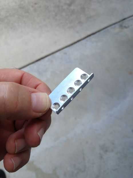 Usar un 1/16" espesor de ángulo de aluminio de 1" x 1". Corte el extremo de la cuerda a 1/4". Taladro de cinco orificios de montaje de 1/8" y avellanar para cabeza plana tornillos. Cuatro #40 cadena agujeros en el extremo de la placa.