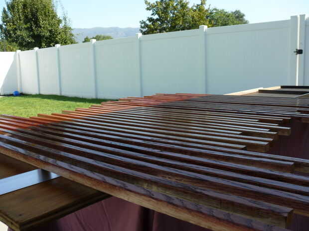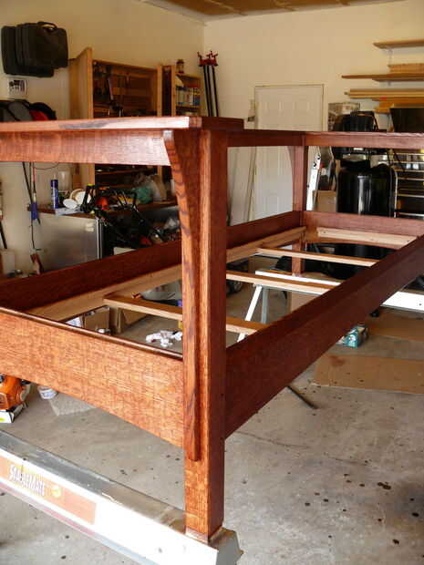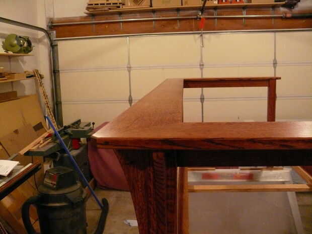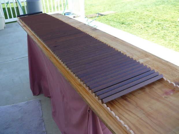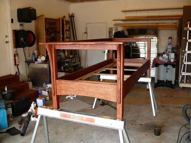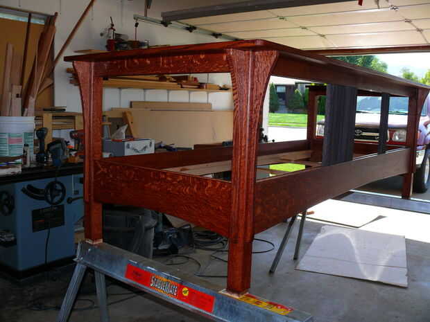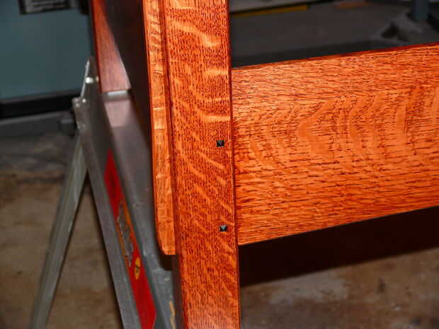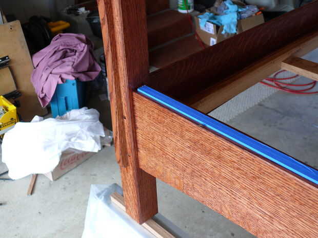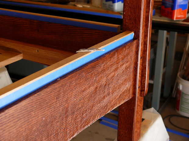 - La capa superior, como se mencionó, fue rociado en barniz satinado Kenvar Super catalizada de Sherwin Williams - tres capas sólidas. Porque había ajuste los ejes precisamente a las mortajas, puse "adhesiva bloques" dentro de las mortajas para conservar el acabado de construir en su interior. Esto también aseguré que el pegamento utilizado para pegar los bloques de relleno en su lugar tendría una superficie de madera a esclavos en lugar de tratar de pegarse a la mancha Kenvar Super final.
