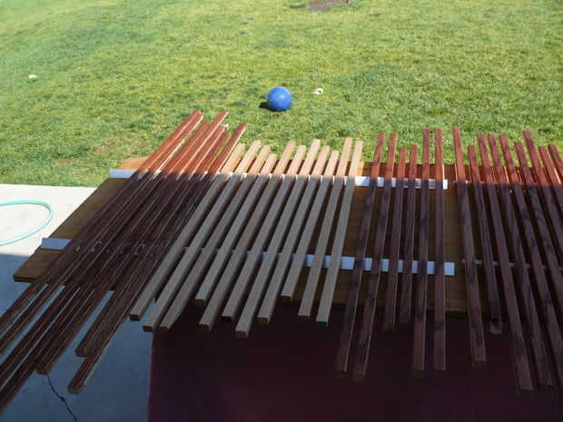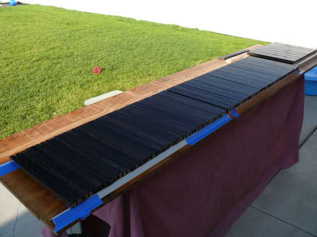 Decidí terminar previamente los ejes porque francamente, tratando de aerosol 300 ejes espaciados 3/4" aparte y obtener una buena cobertura en los cuatro lados sin funciona suena como una fórmula para el desastre (si no es locura). Me tomó varios intentos para averiguar la mejor manera y resultó que una vez más, un poco de tiempo hacer un jig dado de una manera enorme. Al principio traté de trazar ejes plano y toma un lado en un momento. Ese plan fue por la ventana cuando Mac, mi perro, justo después de que había completado rociar una capa de acabado, que sería muy divertido agarrar la mano de la lona sobre la mesa y tratar de hacer el "rasgar el paño de la tabla por debajo de los platos y dejar todo sobre la mesa" truco... buuuut Mac es un perro y aspira en trucos de magia... así que terminó tirando sobre toda la tabla y dumping a todos los ejes en la arena hormigón y sucia hierba... donde el súper duro, Super Kenvar rápidamente curado. Pasé los dos días siguientes lijado de mierda de la meta de 150 + ejes... Mac fue puesto en custodia protectora.