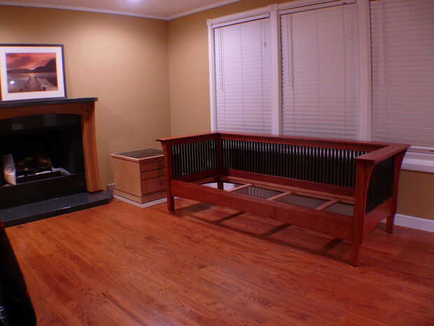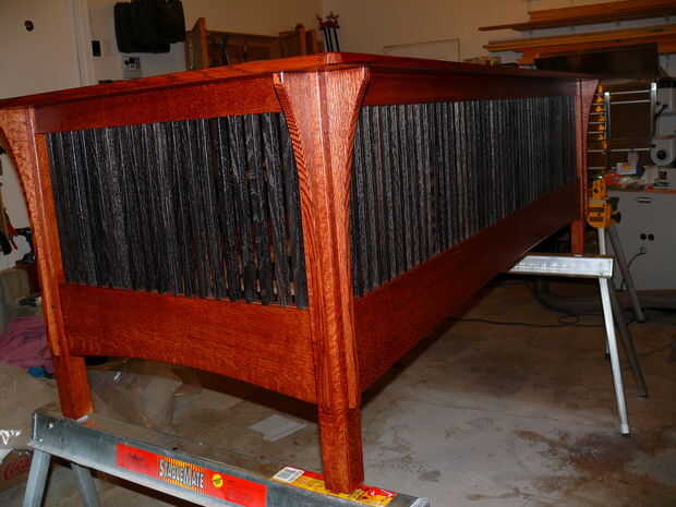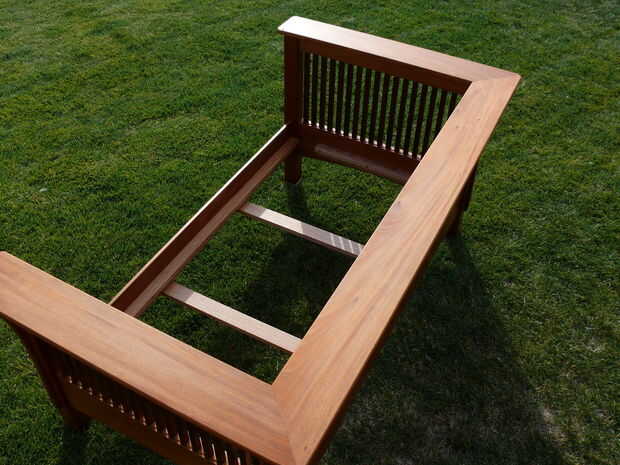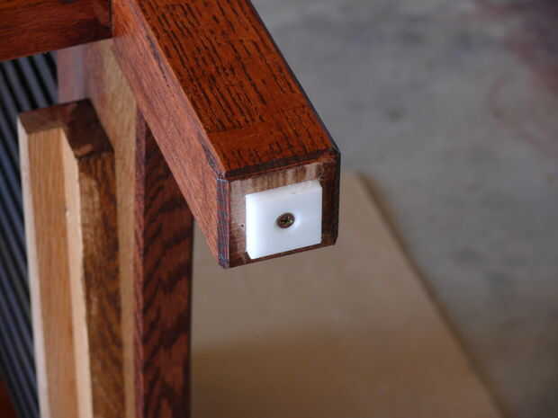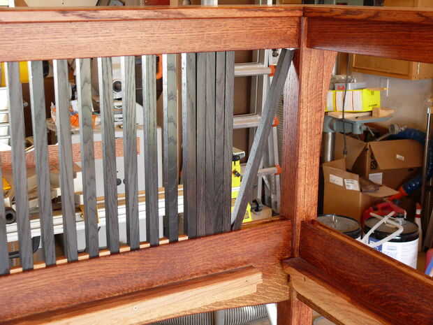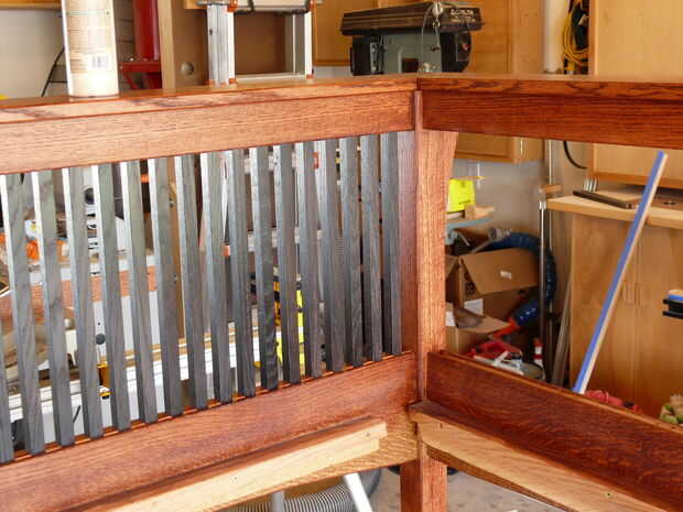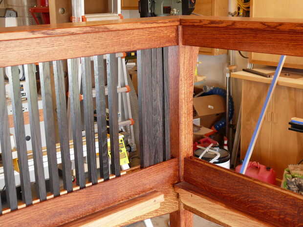 Los husos de la instalación es bastante rápido - tipo de me recordó a tejer por alguna razón. De todos modos, los husos son inclinados en las mortajas y estaba parados para arriba (con un poco de esfuerzo) y los bloques de relleno se establecen entre ellos en los rieles superior e inferior. Coloqué todos los bloques de relleno en sus lados al principio porque quería conseguir los ejes y bloques de relleno en su lugar, luego medir el slop en ambos extremos por lo que pude costumbre corte bloques de relleno para los extremos que se centraría todos los ejes en el bastidor. Una vez tuve los bloques final averiguado, pegué en los bloques de relleno. Otra vez, hice mi propia cosa con los bloques de relleno: en primer lugar, les cónica ligeramente para que se "cuña" en las mortajas firmemente y se sostienen en su lugar mientras el pegamento seca (tal vez 2 grados de proyecto), en segundo lugar, hizo un poco