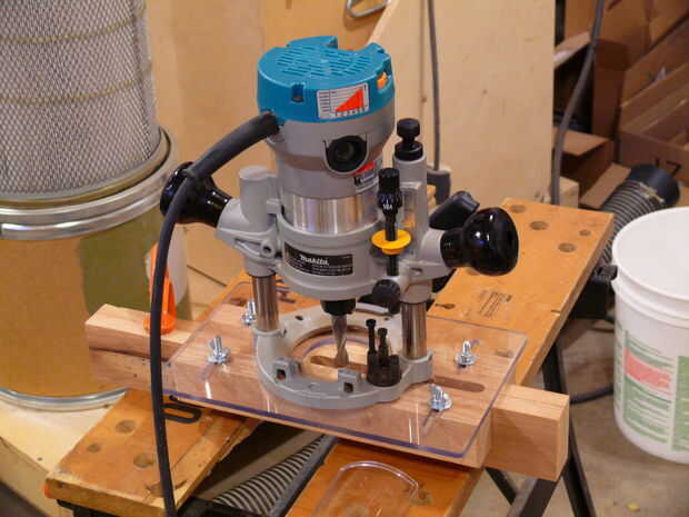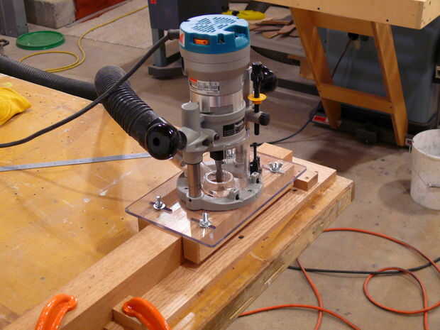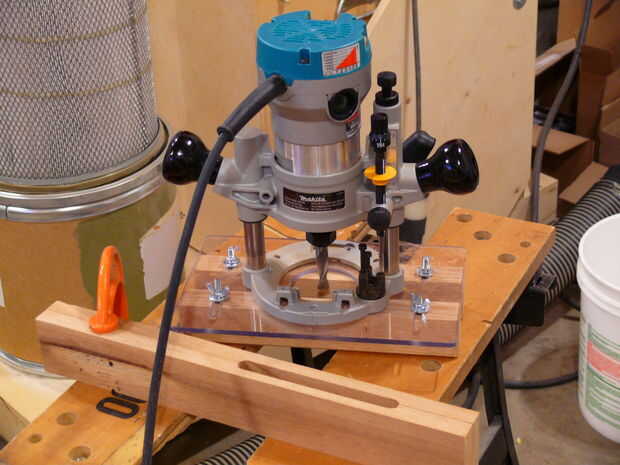 Para cortar las mortajas, construí un trineo personalizado para mi router de inmersión. Es un diseño simple - sólo una hoja de lexan con listones de madera ajustables. Los tacos pueden ser ajustados en o hacia fuera para permitir que el router hacia la pieza de trabajo - puede incluso cortar las ranuras fuera del centro si es necesario. Un buen consejo para hacer que la broca centrada, es tomar un trozo que es el mismo ancho que la pieza de trabajo, Centre la broca como mejor usted puede, hacer un corte poco profundo, entonces gire el trineo alrededor de 180 grados sobre la pieza y ver si la broca se centra todavía en la ranura.