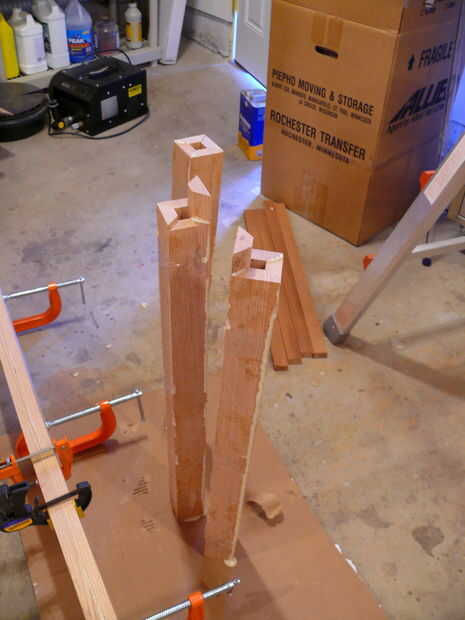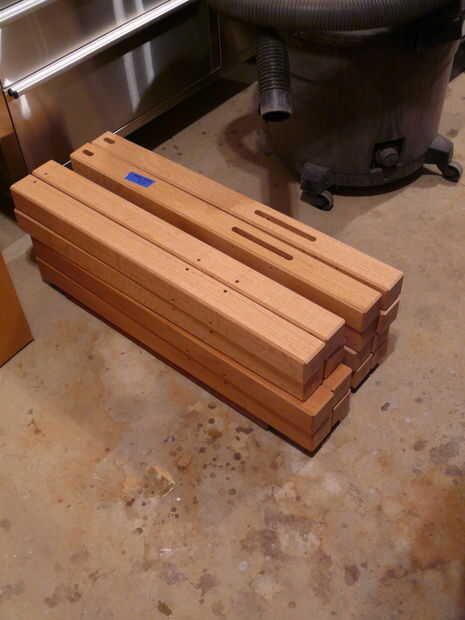 Tenía algo así como 54 mortajas para cortar, así que subió con un simple "jig" que consistía en unos bloques de madera atornillado a mi banco de trabajo (ver imágenes). Dos cuadras encuentra la posición de la pierna, y luego dos cuadras de parada se sujetaron en el lugar para controlar la longitud del corte. Trabajando de esta manera, no pasó mucho tiempo para exacto cortar 54 mortajas todos.