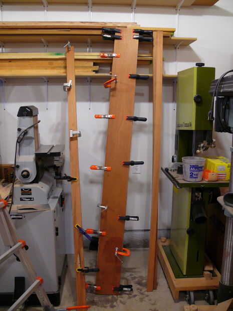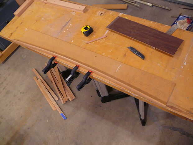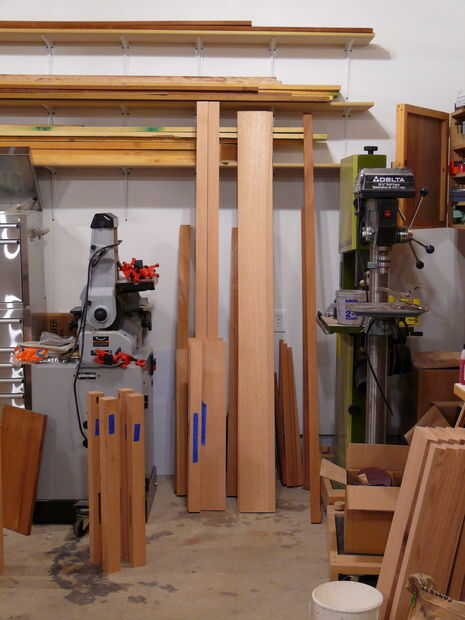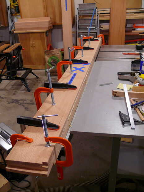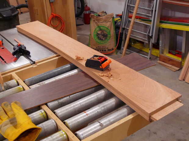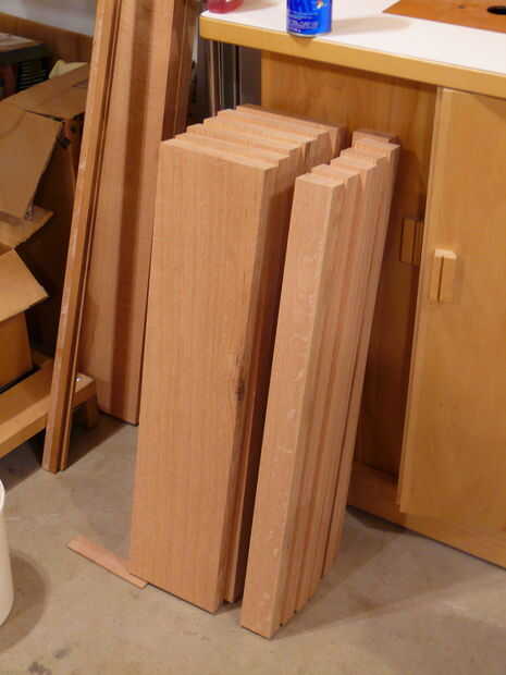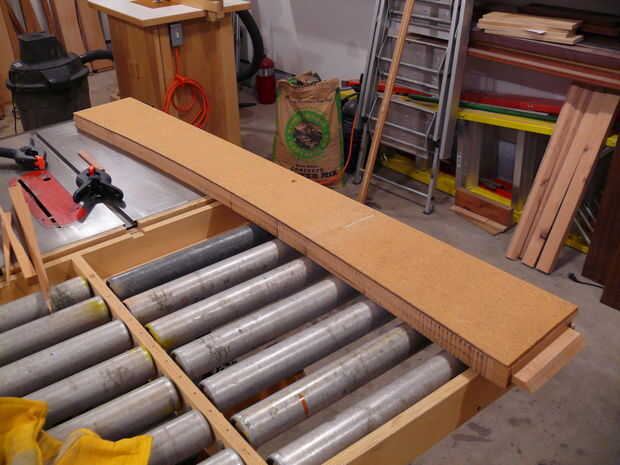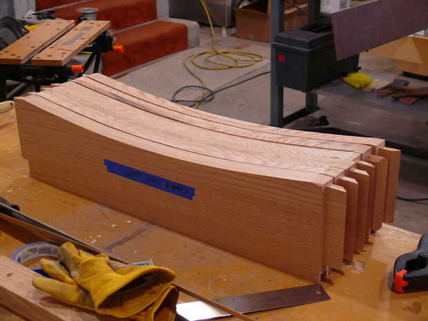 El siguiente paso en el proceso era cortar los arcos en la parte inferior de los rieles - quería curvas en todos mis rieles, a diferencia de los planes originales. Trazado de las curvas de los rieles largos y cortos de material de plantilla (antiguo armario puerta piel, realmente) con un pedazo de madera y pinzas - flexión de la madera de aproximadamente 1" desde el borde y marcar una línea. Esto fue cortado en la Sierra de cinta y limpió con los archivos hasta que tuve una curva suave agradable. Esta curva fue trasladada a la población de carril y la curva era rough-cut en la Sierra de cinta para dentro de aproximadamente 1/16" de la línea. A continuación, la plantilla fue unida al riel con cinta de la alfombra, y un poco de patrón se utilizó para limpiar la curva. Suavizado final en cualquier área áspera fue manejado por un plano de bloque y archivos. A continuación, los rieles fueron dados 1/4 biseles todos los bordes - excepto el borde superior del travesaño inferior delantero. El riel inferior delantero tiene un amplio bisel (1-3/4") a lo largo de la longitud - esto se hizo con un plano de la mano desde que corte con la Sierra de mesa habría sido algo torpe, y realmente fue bastante rápido ya que se acabo sustituido las cuchillas en mi Rali planos (que son planos de mano impresionante, por cierto).