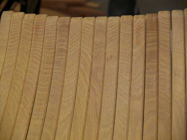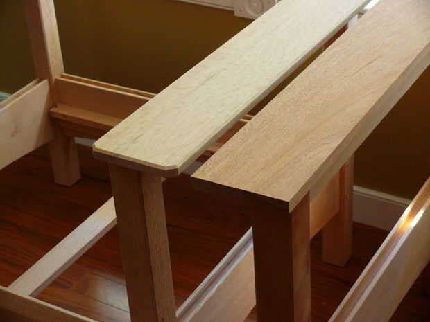 Los reposabrazos son inglete en las esquinas, se unió con galletas y cubrió con tacos en el exterior "punto" de los ingletes. Entonces, todas las esquinas reciben un bisel de 1/4" en la mesa de fresadora.