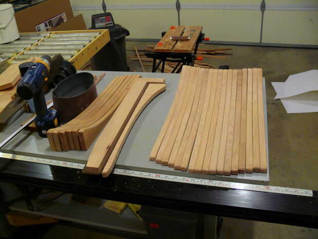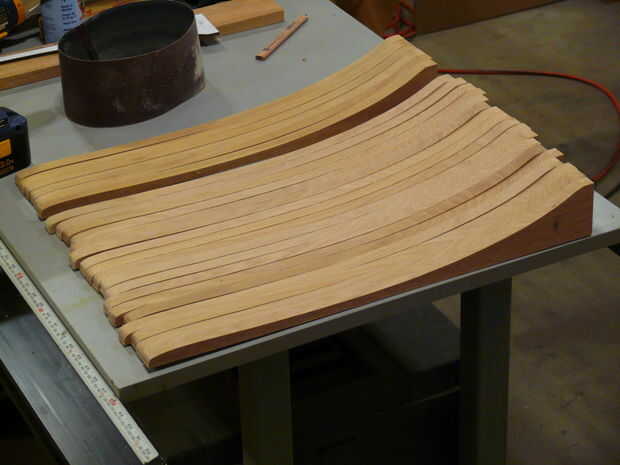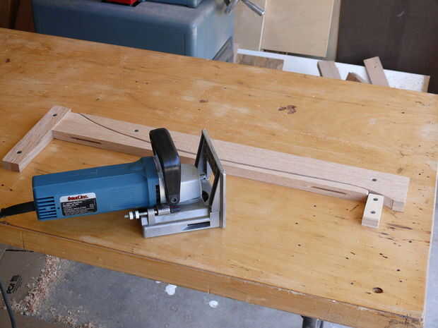 Una vez que las piezas fueron encaminadas a la forma, se lija en los bordes y luego restregar fueron encaminadas en los bordes. Por último, una guía rápida de parte de la chatarra de recorte y algunos bloques fue atornillado al Banco, y galleta ranuras fueron cortadas para una galleta #20 y #10.