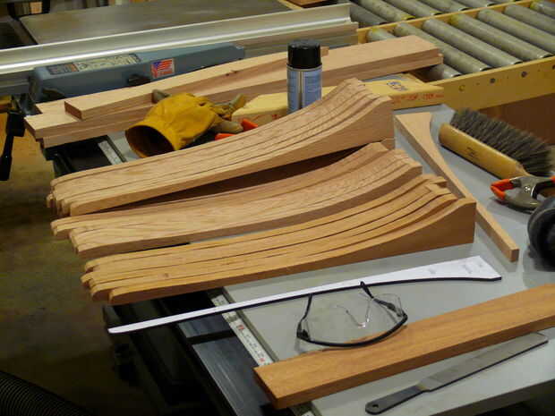 Los "cuervos" son los decorativos "arbotantes" que soportan los brazos amplios en estas piezas. Lo que era bastante sencillo. En primer lugar, una plantilla se presenta en templado aglomerado (Masonite) y alisa de forma definitiva. Esta plantilla fue utilizada tanto localizar la pieza en stock áspera y utilizado como plantilla para dirigir la forma final. Por "anidando" las piezas durante el diseño, era capaz de reducir los residuos. Siempre hago piezas extras en caso de dañar algo sin querer - y más a menudo que no, termino con los extras. La forma fue rough-cut en la Sierra de cinta y finalizando con la mesa de fresadora y plantilla. Esta pieza es fina - que es peligroso en la mesa de la fresadora - así que construí un jig para mantener mis manos lejos de la broca. La pieza áspera fue unida a la plantilla mediante tornillos a través de la espalda (que más tarde ser ranurado para galletas) y es agradable tener un montaje sólido de trabajo con. Menos vibración produce cortes más limpia.