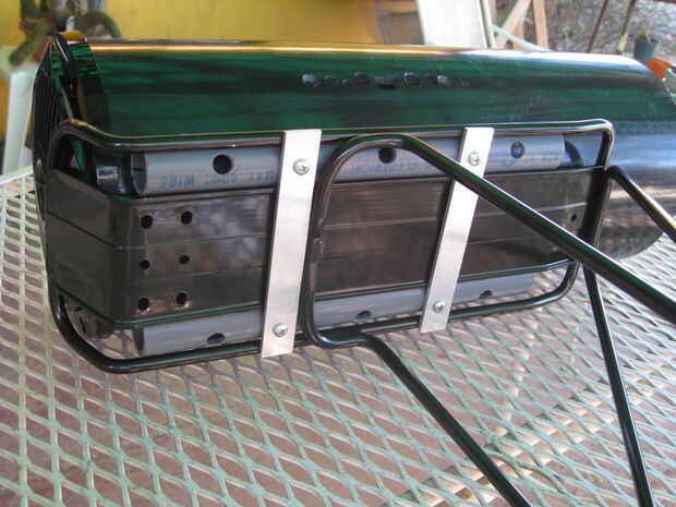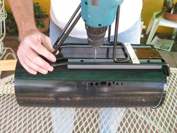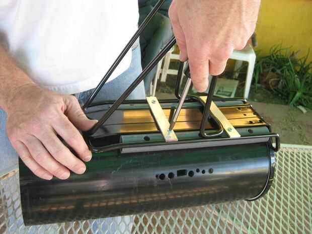 Ahora que se hacen las barras, usarlos para sostener la parrilla en las piezas de conducto. Sujete el ensamble junto con una barra en su lugar. Poner la barra de barra de soporte de centro de la rejilla como se muestra. Perfore agujeros de 7/64" a través de la barra de los orificios en el conducto, luego instale tornillos en los orificios. Repita para la otra barra, pero no tiene que estar en cualquier posición particular. Ver las fotos.