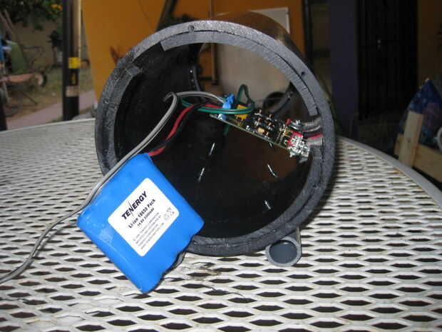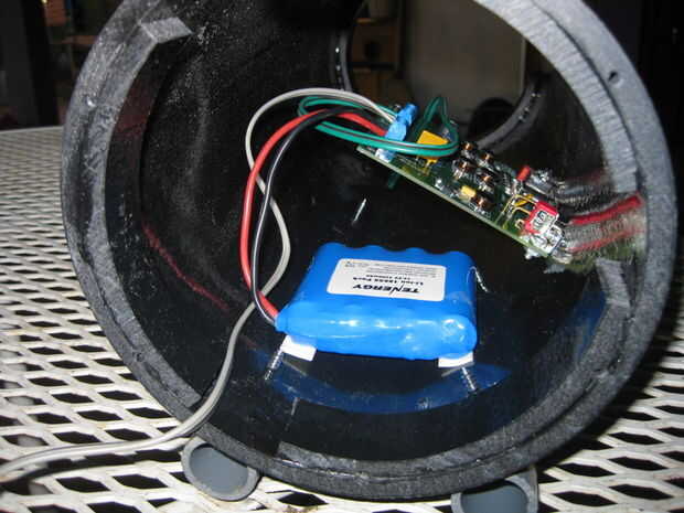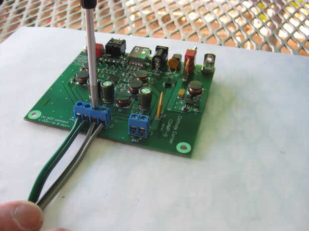 Tira de 3/16" de alambre desde el otro extremo de los cables y conecte a los terminales de altavoz como mostrado. Luego conecte los cables de batería - rojos al positivo y negro al negativo. Por último, Monte el amplificador del tablero en el tubo utilizando dos tornillos de cabeza plana de 8-32 x 1/2".