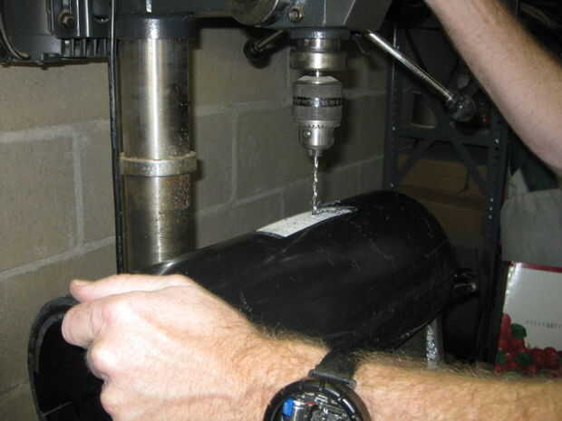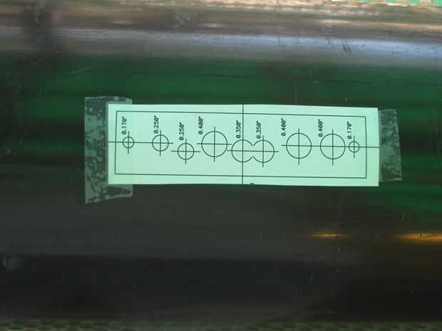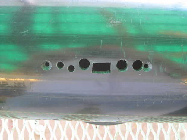 Perforar todos los agujeros hacia fuera a 11/64" en primer lugar, que es el tamaño de los orificios de montaje 8-32 en los extremos de la fila de agujeros. Luego ampliarlas todas excepto los agujeros de dos extremos a 1/4", luego perforar más grande hacia fuera 23/64" o 3/8", entonces los tres agujeros mayores a 13/32 pulg.
