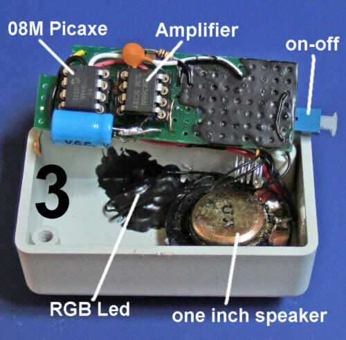 1 pulgadas, altavoces de 32 ohm, LM 386 amplificador, interruptor, resistencias, condensadores,. 1" jefe tomas, RGB LED: http://www.mouser.com