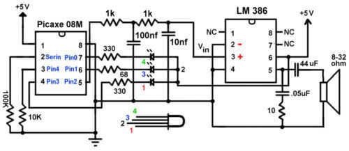 Foto 4 muestra el diagrama esquemático del generador de música al azar. Un controlador de Picaxe de 08 M se utiliza para iluminar el LED RGB y enviar tonos musicales a un amplificador LM 386 que salidas a 1" construido en altavoz.