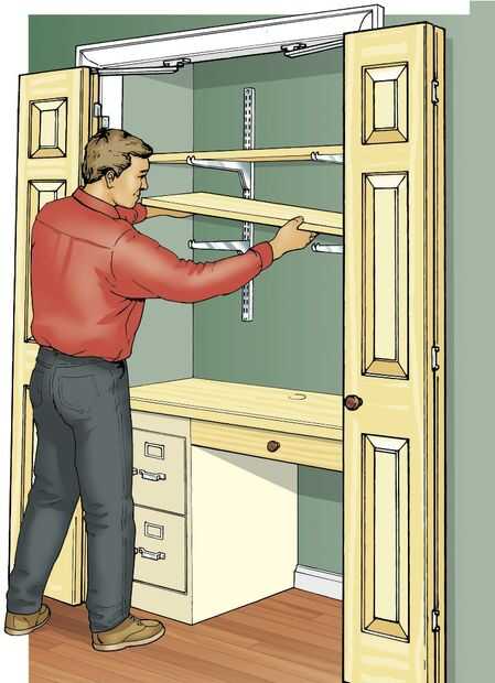Si crees que no tienes un lugar para un escritorio, cajones de archivo y algunos estantes, un lugar que puede proporcionar una solución es un armario en una habitación sin usar. Puede convertir un armario en una oficina pequeña mediante la instalación de un escritorio en un archivador de dos cajones y estantes. Estas instalaciones son más prácticas cuando el armario tiene puertas plegables y una apertura amplia de 48 pulgadas. Reemplazamos las bisagras de las puertas plegables con un sistema especializado de bisagra que permite las puertas swing al lado del armario de apertura.