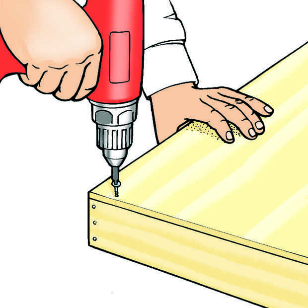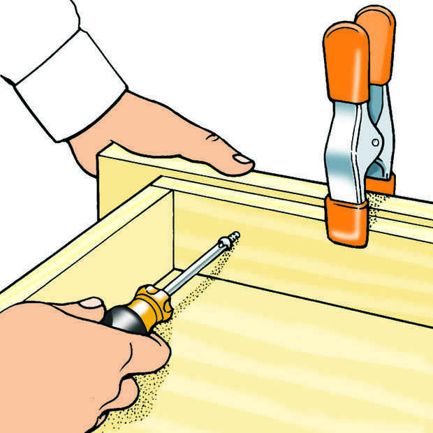 Rip y Álamo corte transversal de madera para la caja del cajón. Montar la caja por pegar y clavar el cajón componentes juntos (Fig. 10). Verifique que la caja es cuadrada comparando frente a mediciones diagonales y deje que el pegamento se establezca.  Cortar un trozo de madera contrachapada de 1/4 de pulgada para el fondo del cajón y atorníllelo a la parte inferior de la caja del cajón con 3/4 no. 6 tornillos espaciados a 6 pulgadas en el centro.