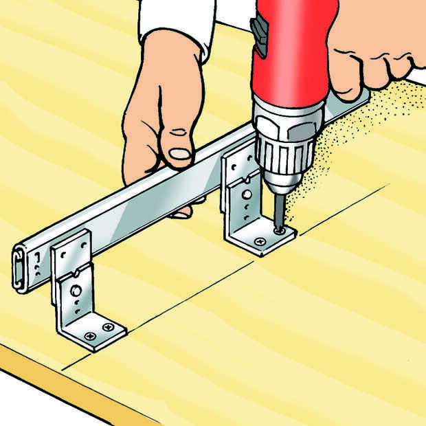 Si desea proporcionar su espacio de trabajo con un cajón de lápiz, es más fácil montar las diapositivas en el escritorio antes de instalar en el armario. Determinar el ancho del cajón que desea construir, luego coloque los portaobjetos en la parte inferior del escritorio.  Hay un número de cajón diapositiva sistemas para esta aplicación, pero que funciona muy bien es de Rockler (parte 81117). Al colocar las correderas, recuerde dejar espacio para el frente de la gaveta, que agrega 3/4 pulgadas al frente de la gaveta. Perforar agujeros en el escritorio y luego instalar las diapositivas por atornillado en la parte superior.