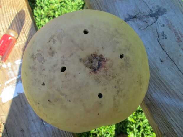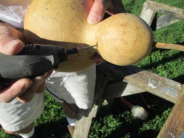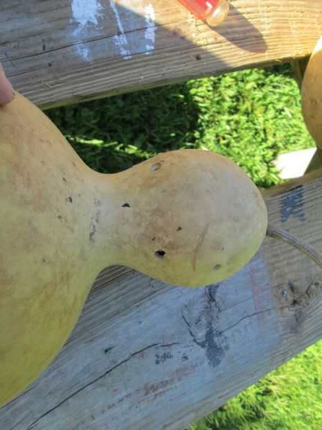 Marca unos agujeros en la parte superior de la calabaza. Ubicarlos de modo que la lluvia no entre en ellos. Use un lápiz para marcarlos primero antes de perforar para asegurarse de que están satisfechos con su ubicación. Suelen situarlos bajo el "Ecuador" de la protuberancia superior si existe. (Dependiendo de la calabaza) O se pueden taladrar en un ángulo hacia arriba. Coloque dos agujeros en la parte superior directamente frente a la unos a otros. Esto es donde el cable se pondrá a través para colgar la pajarera. Colocar unos agujeros en la parte inferior para drenar cualquier agua y proveer de ventilación. Estos agujeros son alrededor de 3/16".