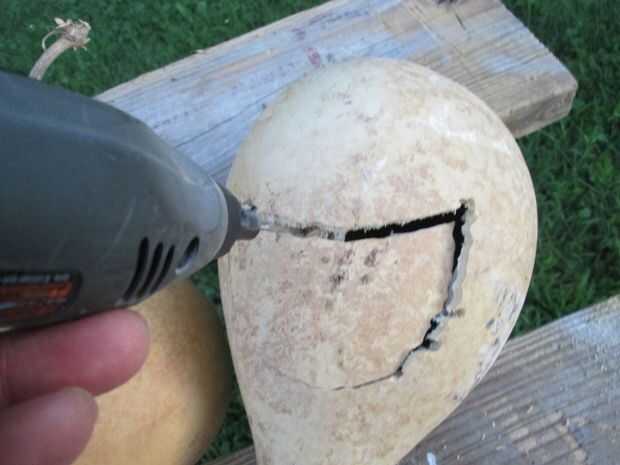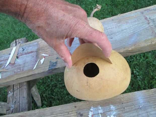 Empezar con un trozo de cartón y corte un patrón para el techo del porche. Yo sólo sigo recortando lo hasta que encaje perfectamente a la calabaza y estoy satisfecho con cómo se ve. Con un lápiz, trazar este patrón a la calabaza extra. Yo suelo utilizar una calabaza de desecho para el que no es de calidad suficiente para construir una pajarera, pero tiene algunas secciones buenas en él. Esta cortado con la punta de yeso y lije con cuidado y alisar los bordes hasta que encaje firmemente en la posición en la pajarera. No debe ser espacios donde coincide