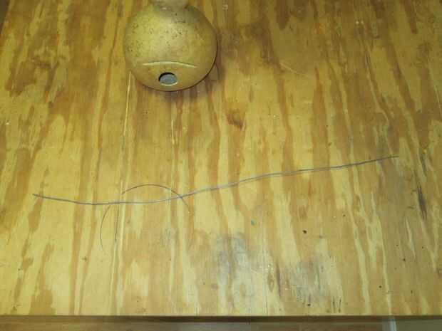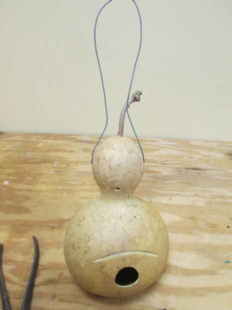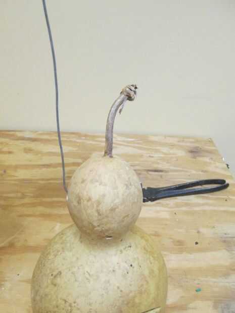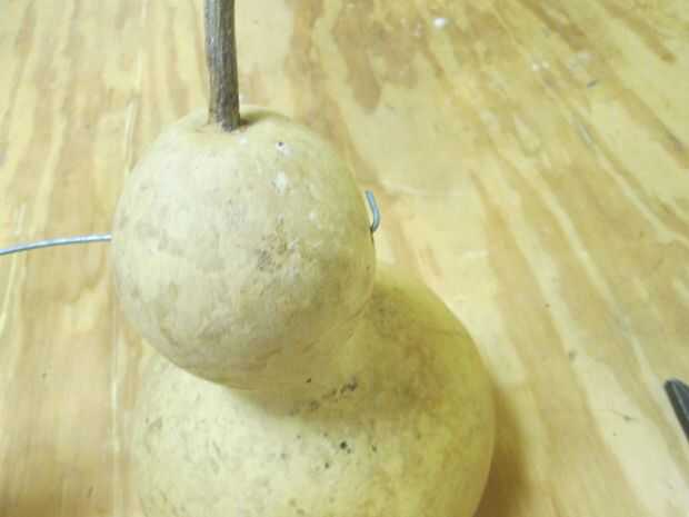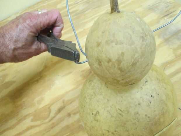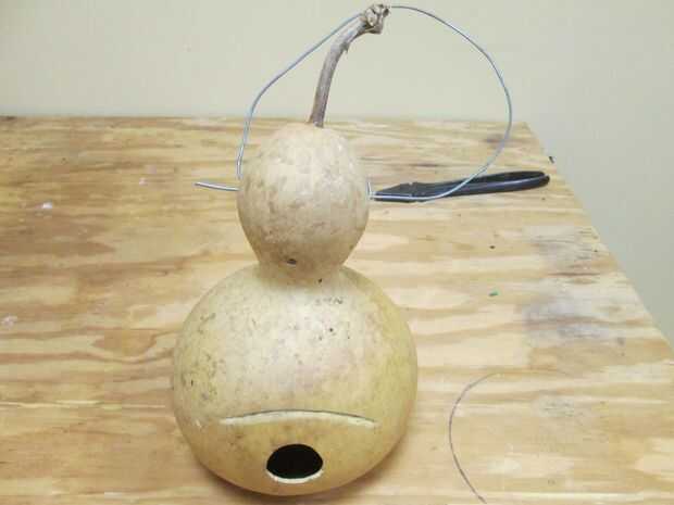 Poner el hilo por los agujeros que ha perforado directamente frente a la unos a otros en la parte superior de la calabaza. 1/2" de la curva el alambre a 90 grados para evitar tirando hacia atrás a través del orificio (ver cuadro #3), luego doblar el resto del cable hacia arriba. Lazo el extremo detrás a través de los agujeros para formar un asa por encima de la calabaza. Curva 1/2" otro pedazo de alambre para evitar que tirando hacia fuera. Entonces forman el cable por encima de la calabaza en un buen mango mirando que colgar en los árboles o en un gancho (ver última foto)
