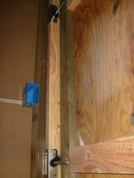 Para mi la puerta, tuve que añadir un soporte vertical para el tornillo pase a través. Utilicé la madera de sobra para hacer la superficie de montaje horizontal que los solenoides a. Reforzado el paso vertical con algunos hardware de encuadre que encontré en Home Depot. Las placas (las placas de metal montadas en el bastidor de la puerta) son de acero de desecho que tenía puesta alrededor. Los agujeros fueron perforados a través de las placas, refuerzos de acero y madera para acomodar el pasador de acero.