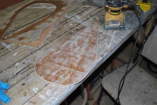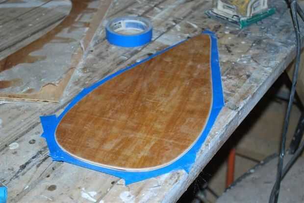 Arena por ambas partes con el grano 60, suavemente sobre la hoja, asegurándose de no exponer la tela. No tengas miedo de usar tal papel rugoso, ya que funciona mejor para moler abajo de los puntos altos. Uso de un papel demasiado fino muy pronto hará una superficie ondulada. Limpiar ambas partes con la acetona y el polvo por su área de trabajo. Añadir una presa de cinta adhesiva a la parte plana de la hoja, como en la imagen. Esto evita epoxi líquido bajo la lámina y hacer duro arena gotas.